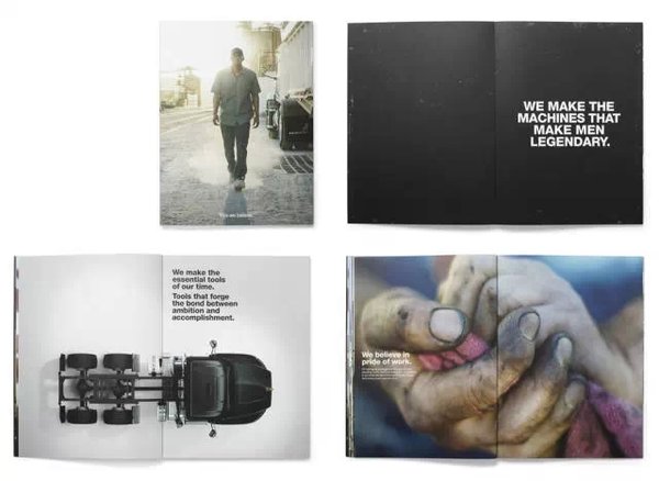 图片中还展示了迈克卡车工作人员酷炫的名片、产品介绍彩页、斗牛犬车标、各展览当中的展台设计以及迈克的广告牌,标定一种形象,一切设计围绕稳定性、力量和活力,处处可以感受到斗牛犬般坚定、勇敢的性格。