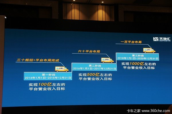目前天地汇已经制定有5年战略规划,战略第一阶段,至2015年末完成30个枢纽及平台布局完整,届时,天地汇在全国实现大于30个枢纽城市落地园区、整合线下超过1万亩物流园区,管理超过100亿资产。第二阶段,2016年整年,天地汇完成60平台布局,实现500亿元左右平台营业收入目标。而第三阶段,至2020年末,完成100平台布局,实现1000亿左右的平台营业收入目标,干线车辆每天大于2万车,配货车辆每天大于20万辆,最终完成每天300万票的运输任务和每天1000万的税收,在行业有着独有的影响力。