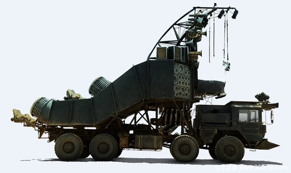 第一眼笔者也看不出是什么车型,但将其拆分会变得很清楚,车头不难看出源自一辆Peterbilt 358系列车型,驾驶舱是拼接的一辆经过切割的道奇老爷车,油罐车尾部的炮台则是一辆大众甲壳虫后半段。