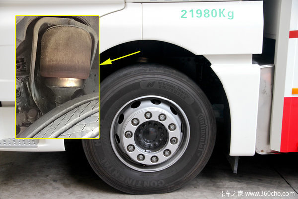 除了驾驶室是一大亮点外,整车的悬挂方式也是一个比较有看点的地方,全车采用气囊减震,前桥、后桥,以及第三轴,都是采用气囊悬挂,第三轴为单胎结构,并且可以随动转向,小编猜测应该还具有提升功能。