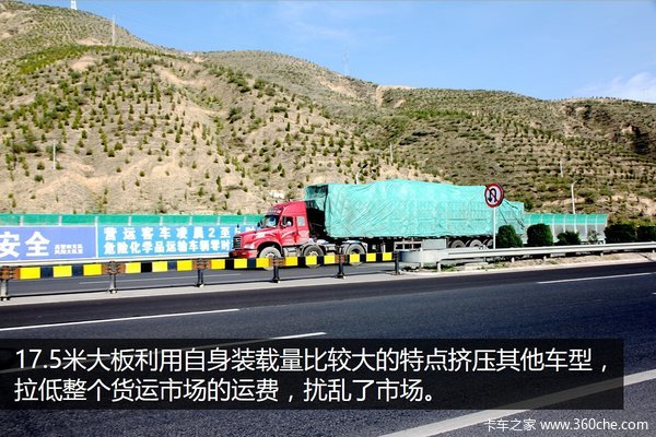 在几年以前,国家就已经出台了相关的政策,限制17.5米大板的上牌事宜,目前国内套牌的大板比较多,常常是一套手续对应多台大板。17.5米大板利用自己装载量比较大的特点挤压了13米挂车的市场,拉低了整个货运市场的运费,形成不公平的竞争,使运费越来越低。