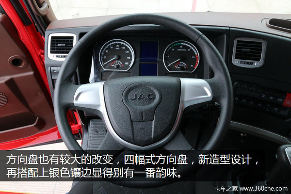 来卡车之家App【卡车之家 原创】在江淮2016年商务大会上,江淮格尔发推出了全新K7系列平台产品,包括K7 6×4载货车、一款K7 8×4载货车和K7 4×2载货车,K7平台最大的特点就是采用了新型驾驶室,本篇文章就介绍其中一款转向桥可提升的8×4 载货车。