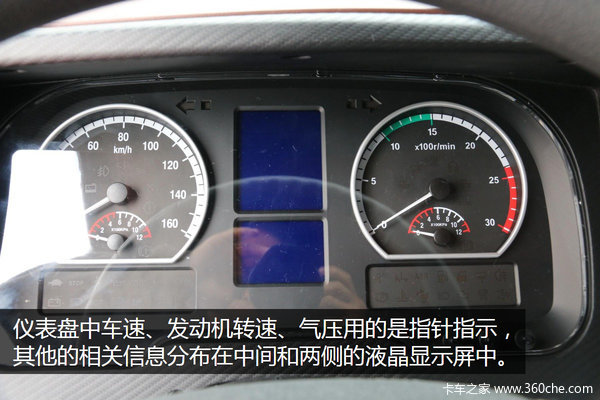 仪表盘中车速、发动机转速、气压用的是指针指示,其他的相关信息分布在中间的液晶显示屏中,两侧指示灯来显示各个部件的工作情况。