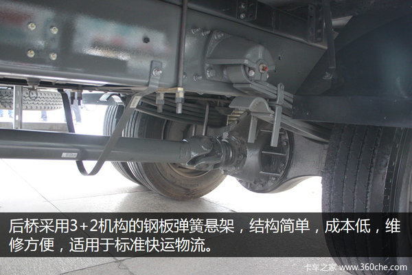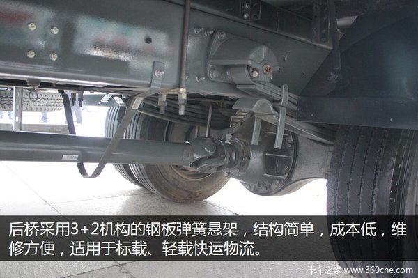 后桥采用3+2结构的钢板弹簧悬架,结构简单,维修方便,适合快递物流,不过相对气囊悬架来说,舒适性差,重量大。