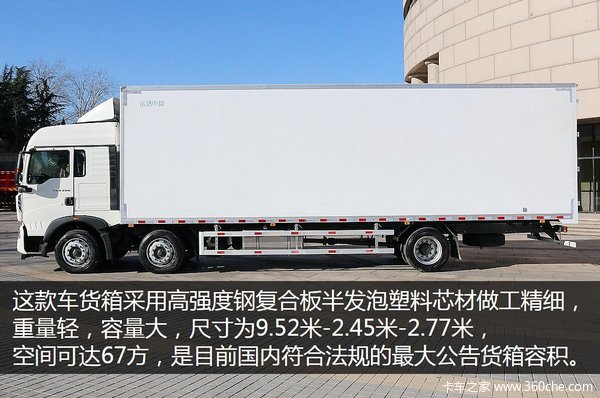 这款车货厢是重汽和常熟申毅共同打造的适用于物流快运的专业货厢,采用高强度钢复合板,做工精细,重量轻,容量大,箱体尺寸为9.52米X2.45米X2.77米,空间可达65方,是目前国内符合法规的最大公告货厢容积,非常适合城市物流和电商快递等对容积要求较高的行业。