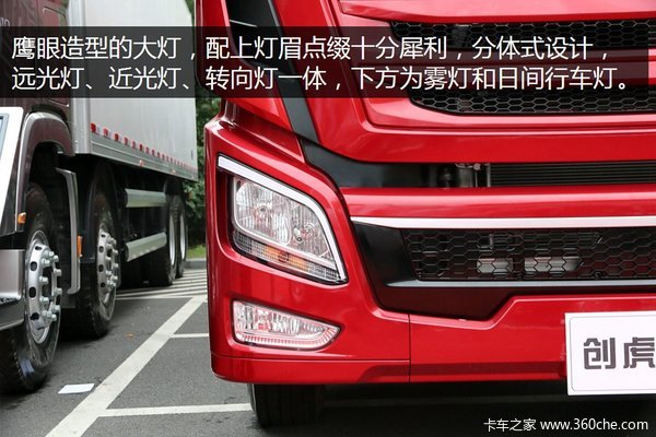 这台畜牧车采用了高顶平地板驾驶室,红色的涂装,V字型的前脸,进气格栅并排长条状,企业LOGO在中间嵌入,动感十足。