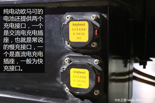 纯电动欧马可的电池还提供两个充电接口,一个是交流电充电插座,也就是常说的慢充接口,一个是直流电充电插座,一般为快充接口。交流电充电插座能用家庭电路来充电,充电的速度相对较慢,而且使用家庭电路来充电还是需要注意电路的承载能力。而直流电充电插座则是通过专用的充电设备来对电池进行充电,具有充电速度快和功率大的特点,一般能比交流电节省三分之一的充电时间,但快速充电也是由一定的弊端的,充电的速度过快,会导致电池的衰减,使电池的容量下降,直接导致车辆的行驶里程减少。一般电池的寿命是3到7年,一般在3到4年后开始衰减到原容量的80%,这其中主要还是看各家的技术。