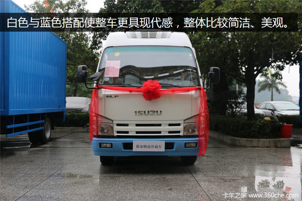 这款都市冷藏车的外观沿用了100P经典的造型,白色与蓝色搭配的涂装,使得整车更具现代感。长条形的进气格栅上方设有庆铃五十铃的标志,整体比较简洁、美观。