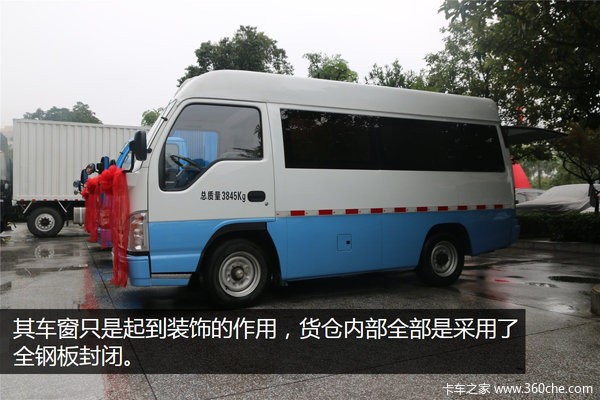 该车从侧脸看与一般的客运车相像,但是它的外层车窗只是起到装饰作用,其货仓内部全部采用了全钢板封闭。在车门上也注明了它的总质量为3845千克,并且该车的轴距为2490可选3360,可以上蓝牌。