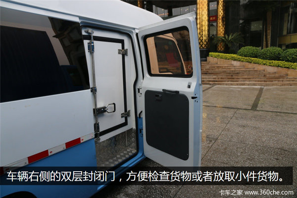 内部货仓由双层门封闭,第一层是普通的上掀开启门,打开后里面还有一个左侧开启的密封门,这样的设计对于冷气的储藏以及内部的密封性会更高。同时,为方便搬卸货物,该车在车门开启处还安装了一个钢制的脚踏板。