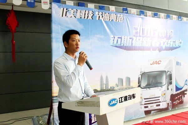 深圳市大胜江淮汽车销售服务有限公司总经理万冲先生作精彩致辞。“江淮汽车16年前2月销量排名跃居行业第一,为了答谢广大新老江淮客户,特举办本次活动。本次活动将重点推介帅铃迈斯福系列产品,迈斯福作为世界最知名发动机厂商,产品品质深受用户认可与信赖。迈斯福发动机 应用高压共轨喷射和分级燃烧室技术,降低10%燃烧消耗的同时,爆发澎湃的动力,彰显与众不同的动力性和经济性。”