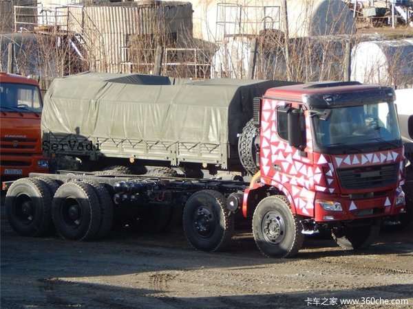来卡车之家App【卡车之家 编译】近日,俄罗斯乌拉尔汽车的工厂内再次爆出谍照,照片上是一辆8x4载货车。关于这辆车的具体参数配置还不得而知,但据外媒透露,其采用的是中国产的驾驶室、悬架系统和变速箱,不过匹配的仍是自产发动机和车架。