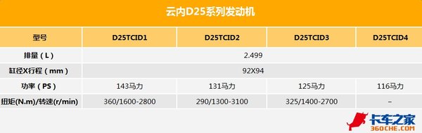从参数中不难看出,目前D25有4个型号D25TCID1、D25TCID2、D25TCID3、D25TCID4,即四个功率水平,各个发动机型号所对应的发动机功率水平和峰值扭矩依次降低,也就是D25TCID1功率最大,D25TCID4功率最小。