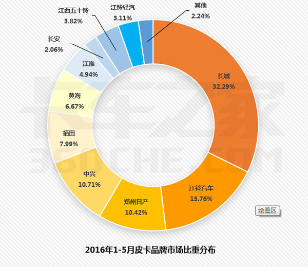 1-5月累计共有5家销量过万的企业,总共占去77.17%的市场。其中,长城占32.29%的市场比重,高居榜首优势明显;江铃汽车占15.76%居次席;中兴占10.71%,郑州日产占10.42%,福田占7.99%,分列三、四、五位。
