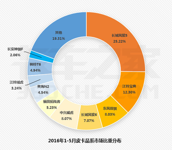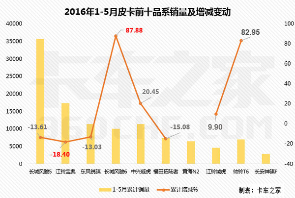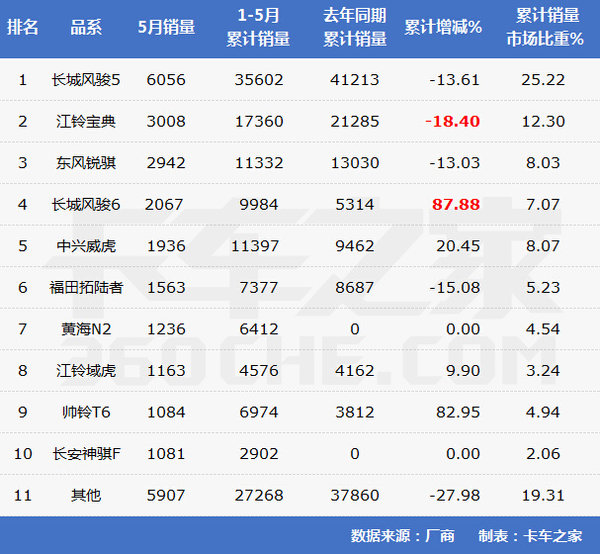 5月份,长城风骏5共销售6056辆,本年累计销售35602辆,累计同比下降13.61%;江铃宝典销售3008辆,本年累计销售17360辆,累计同比下降18.40;东风锐骐销售2942辆,本年累计销售11332辆,累计同比下降13.03%。