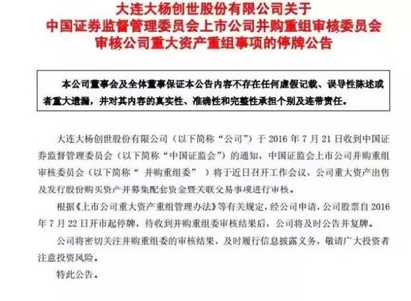 申通、圆通、中通、顺丰、韵达,五大快递齐上市,终究谁能抢下快递第一股呢?近日,有消息传出,圆通速递的“壳”公司“大杨创世”于7月21日收到证监会通知,“证监会上市公司并购重组审核委员会”将于近日召开工作会议,对公司重大资产出售、发行股份购买资产并募集配套资金暨关联交易事项进行审核。