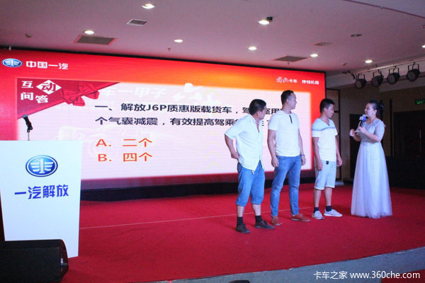 在推介会现场,为了能让用户更好的了解解放J6P产品的产品性能和优势,晨阳汽贸市场部赵丽娟经理从产品的安全性,可靠性,经济性,舒适性等方面详细介绍了解放J6P8X4质惠版载货车的产品性能和产品魅力。并针对产品知识与现场用户进行了热闹的有奖问答互动环节,解放客户参与热情高涨,积极参加。