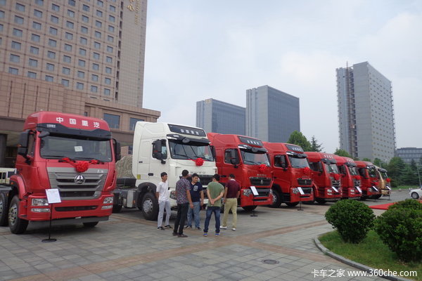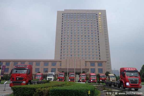 在济宁圣都国际会议中心外,中国重汽的展车整齐停放,供与会的领导、客户参观。展车以目前最普遍的豪沃T7H和豪瀚车型为主,这两款车也是重汽在市面上销量和口碑都非常不错的车型。