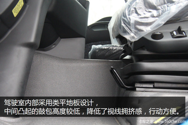驾驶室内部采用类平地板设计,中间凸起的鼓包高度较低,因此降低了视线拥挤感,而且这一高度并不影响主副驾驶更换座位。