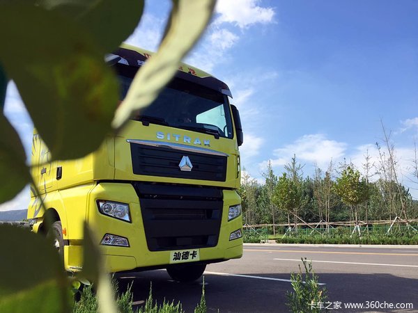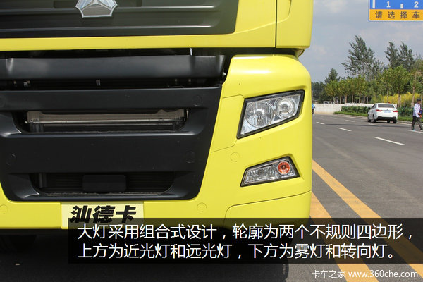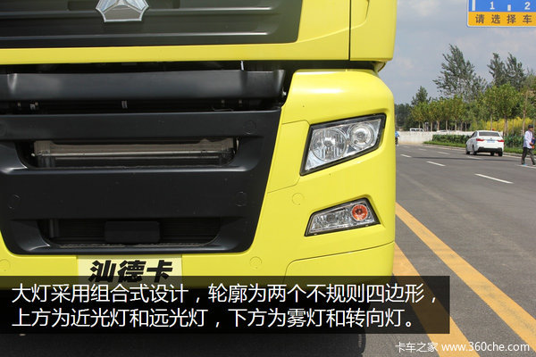驾驶室为高顶式设计,全车采用了亮黄色涂装,在蓝天白云的衬托下显得格外醒目。“V”型前脸是汕德卡一贯的识别特征,左、右两侧和车顶的导流罩能够有效减轻车辆行驶过程中所产生的空气负压,从而降低行进阻力。