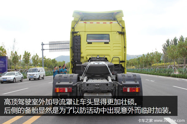 驾驶室为高顶式设计,全车采用了亮黄色涂装,在蓝天白云的衬托下显得格外醒目。“V”型前脸是汕德卡一贯的识别特征,左、右两侧和车顶的导流罩能够有效减轻车辆行驶过程中所产生的空气负压,从而降低行进阻力。