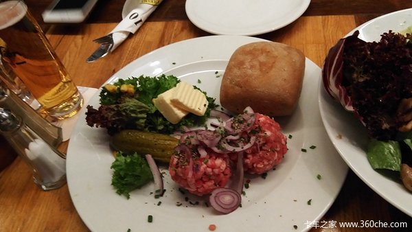 德国友人切开面包,夹上这种生猪肉球,吃起来很享受的样子。他们还向我极力推荐,小编到底过不去心里的那道坎——像我这种连吃生鱼片都会三思而行的人,对着生猪肉实在是无!法!下!咽!