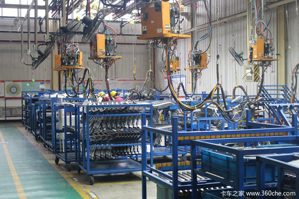 帅铃的焊接工艺,大量的使用了工业机器人,带我们参观的轻卡二厂厂长高厂长跟我们介绍说,这条帅铃专用的生产线共有14台工业机器人,其中焊接车间使用了十台,全部由德国进口的库卡(KUKA)机器人,精度非常的高,软件是由江淮自己开发编程的,机器人进行焊接,精度和强度都能很好的得到控制。十台机器人同时作业,分工有序,也大大的提高工作效率,降低了失误的风险。结束焊接整拼后,初具成型的驾驶室总成就会上升进入到隔壁的装配线,排队进行安装驾驶室的车门。