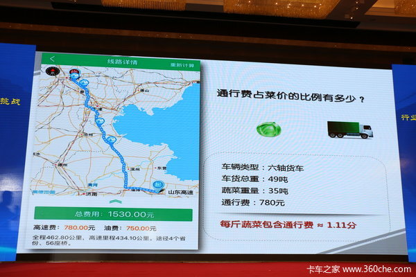 通过山东高速推出的App可了解到:卡车将蔬菜从寿光运到北京,全程需要缴纳780元的高速公路费用,并消耗750元柴油。通过简单的计算可知,每斤蔬菜平均需要公摊的过路费只有1.11分钱,而每斤蔬菜公摊的油费则更少,只有1.07分钱。