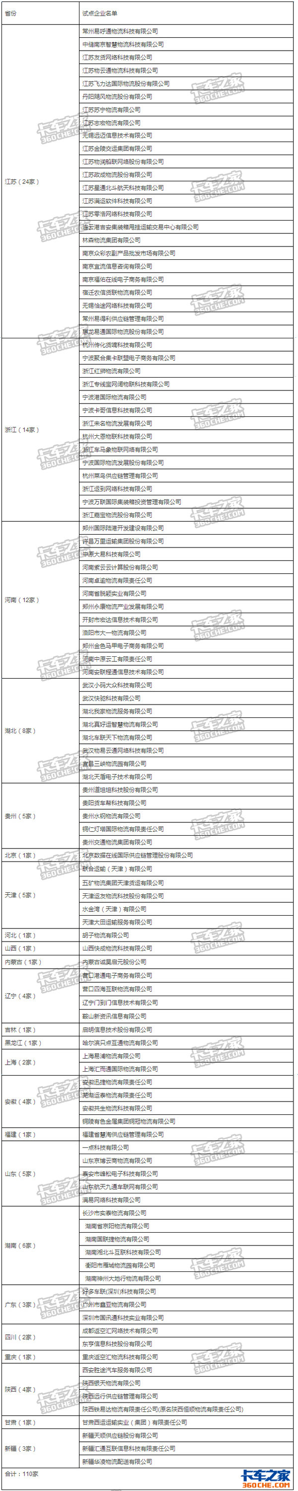 截至目前,全国已有110家试点企业接入部监测平台,且接入企业每日运单数、运量都接受监测!其中,第一批接入的江苏、浙江、河南、湖北、贵州五省共有63家试点企业接入,接入率为90%,其他各省也有接入,名单如下: