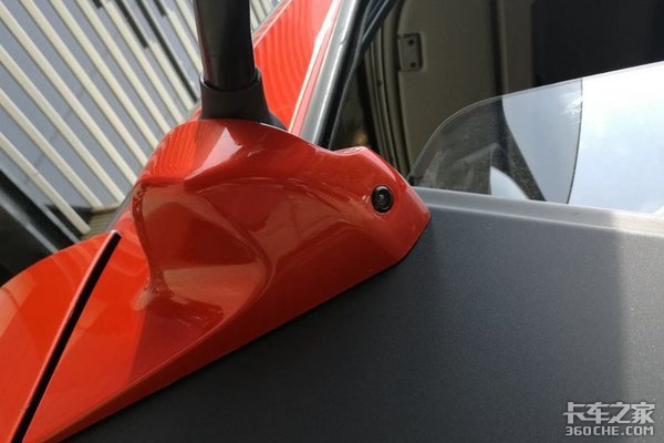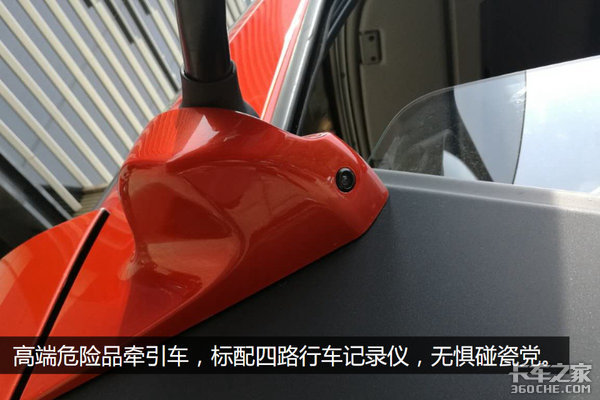 首先是侧视摄像头,目前不少地区碰瓷党横行,各种敲诈手段层出不穷,普通的前视单路行车记录仪已经不能满足使用需要。为此,这辆J6P高端危险品牵引车原厂标配了四路行车记录仪。这个配置非常接地气,我给点个赞,但唯一不足的是摄像头的安装位置,放在后视镜支架根部视野会受到一定限制,导致挂车最后部两侧的情况不一定能拍到,如果能移到后视镜壳体边缘更好。