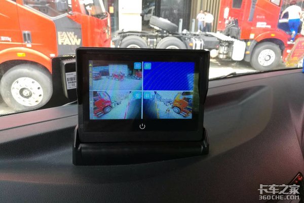 在驾驶室内仪表台上,装有独立式的液晶显示屏,可以实时看到四个摄像头拍摄的画面。由于现场的这辆车没有带挂车,所以后视摄像头暂时没有画面。不过贴心的一汽已经将安装套件随车携带,连接挂车之后,自己就可以安装。
