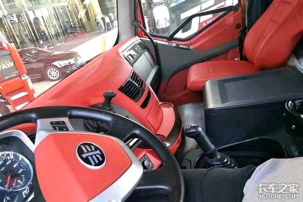 这款南方版牵引车的内饰采用了非常醒目的中国红,对于已经习惯了黑色内饰的我来说,这个颜色确实让我怦然心动。红色是咱们中国人心目中的吉祥色,人们都相信这个颜色能带来平安和好运,估计这也是一汽之所以要开发这个颜色内饰的一个原因吧。