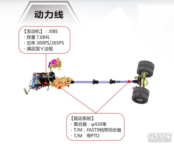 J08发动机秉承日野的最新技术,采用电控共轨燃油系统,满足国Ⅴ以上排放标准,采用独特的顶置凸轮驱动和后置齿轮传动系统,具有更加高的轻量化水平。作为一款6缸柴油机,J08E发动机的缸径为112mm,行程130mm,缸心距126mm,其功率覆盖范围为180kW(245ps)~222kW(300ps)。