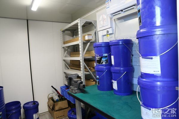 右边的集装箱集合了维修、空气机、润滑油库三个功能。在这个集装箱的维修间,维修技工可以利用工具进行维修。维修间内带有空调,可以为维修人员提供良好的工作环境。沃尔沃认为,维修技工工作环境舒适,车辆的维修保养质量更加有保证,只有高品质的维修保养才能确保卡车在路上高效、安全的运行。