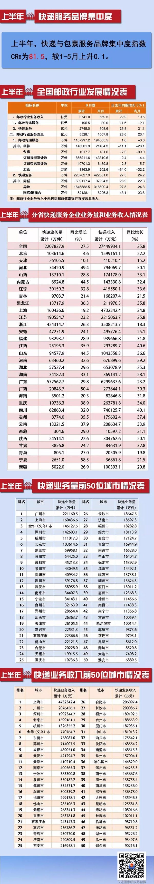 上半年,累计完成快递收入预计达2745亿元,同比增长25.8%,是同期服务业生产指数增速的3倍多,增速居服务业前列。