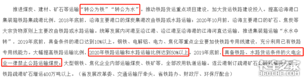 钢铁、电解铝、电力、焦化等重点企业要加快铁路专用线建设,充分利用已有铁路专用线能力。大幅提高铁路运输比例,2020年铁路运输和水路运输比例达到50%以上。