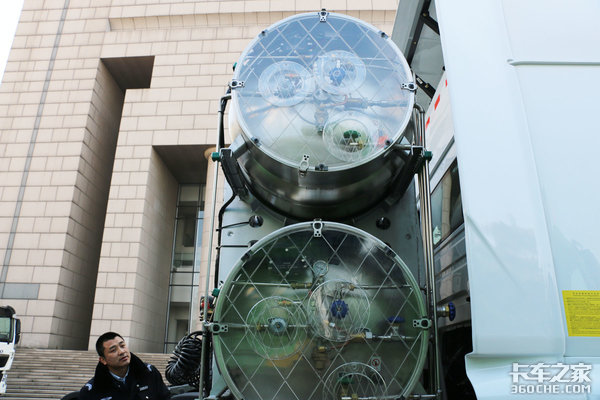 在驾驶室后方安装了两个900L的气罐,总容积达1800L,这样的搭配在LNG车型上可以说是十分强大的,不仅可以大大增加驾驶里程、减少加气次数,而且还可提高运输效率,这样的搭配在定位于煤炭运输的它身上可以说是十分出色。
