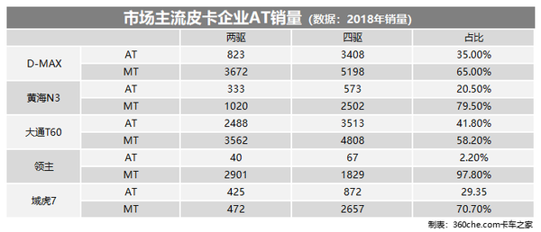 从2018年皮卡销量细分数据也能看出一二,AT才占比整理市场的4%。