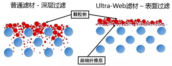 Ultra-web® 滤材通过将一层超粗细相当于人体头发丝的1/300的亚微米级纤维粘附在普通滤材的表面,能够将脏空气中的大部分灰尘颗粒阻挡在滤材表面。