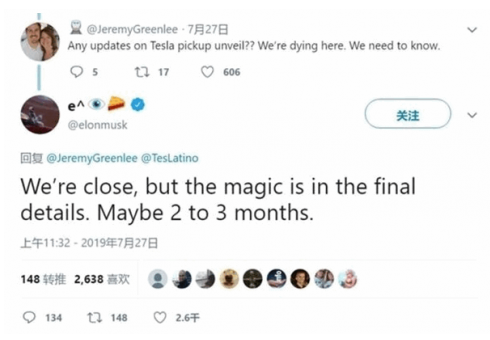 马克思透露,特斯拉电动皮卡将在1-2个月后亮相