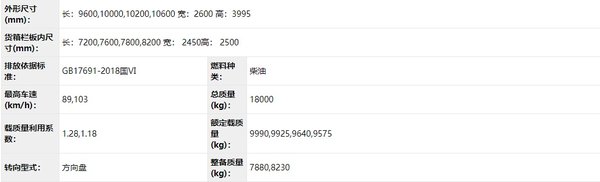 从公告资料看出,该车总质量为18吨,货厢级别分为6.65和6.8米,为应对多种工况需求,车辆板簧悬架拥有多种组合方式。