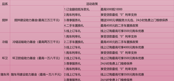 1.针对呕泥酱等工程建设防疫保障网红车辆给予限时特价优惠(搅拌、冷链、环卫、随车吊);