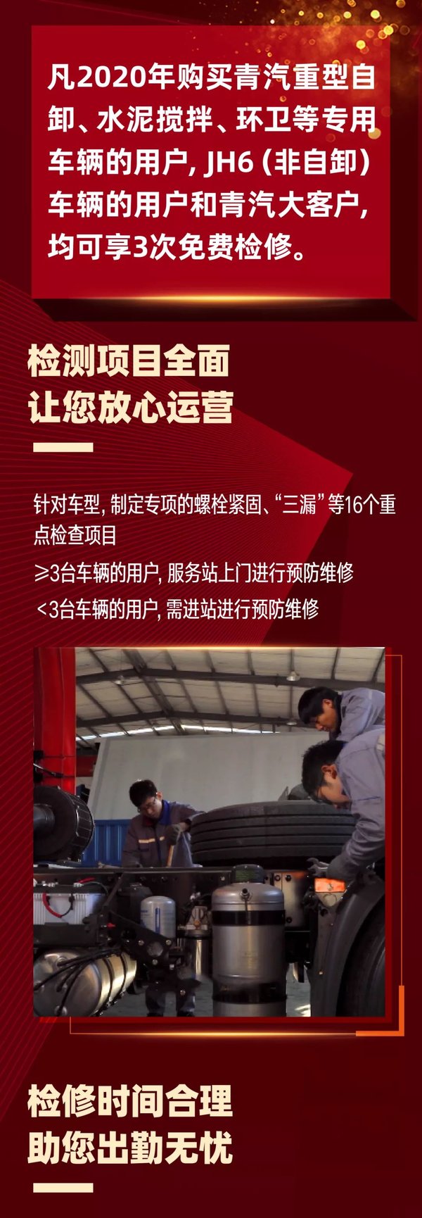 凡2020年购买解放青汽重型自卸车、水泥搅拌车、环卫等专用车、以及JH6车型(非自卸)的用户,包括解放青汽大客户,均可享受三次免费检修,以便卡友提前维保车辆,尽早消除潜在故障,确保车辆状况良好。