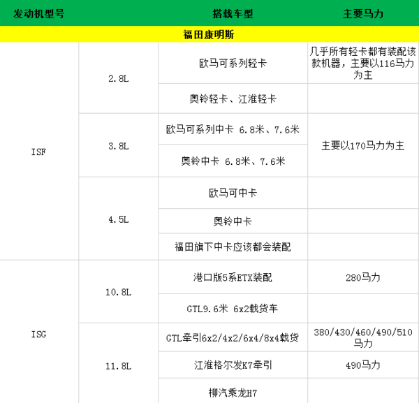 目前搭载福田康明斯发动机的车型有: