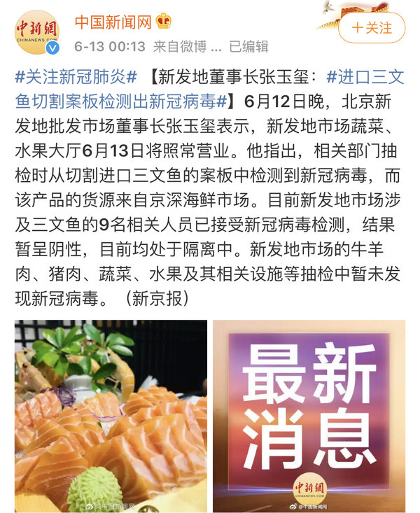 据北京新发地批发市场董事长张玉玺表示,相关部门抽检时从切割进口三文鱼的案板中检测到了新冠病毒。据悉,北京的主要商超企业超市发、物美、家乐福都已连夜下架全部三文鱼。