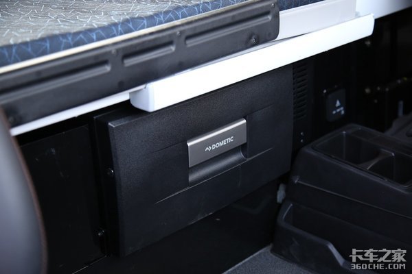 亮点部分在于这个卧铺下方原配的DOMETIC GROUP车载冰箱,炎热的夏季行车如果随时都有冰凉爽口的饮料喝那简直是一件不能再舒服的事了,并且原装的冰箱与整车的匹配度和可靠性都更强,这也是许多欧洲高端车型常见的配置。