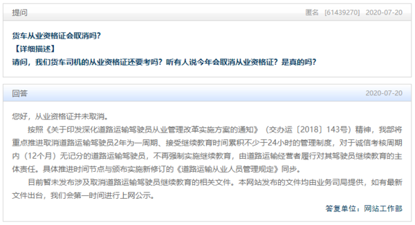 来卡车之家App【卡车之家 原创】近年来,网上关于“取消从业资格证”的呼声一直很高。近日,有人在交通运输部官网提问是否会取消从业资格证,得到答复为“并未取消,并且目前暂未发布相关文件”。