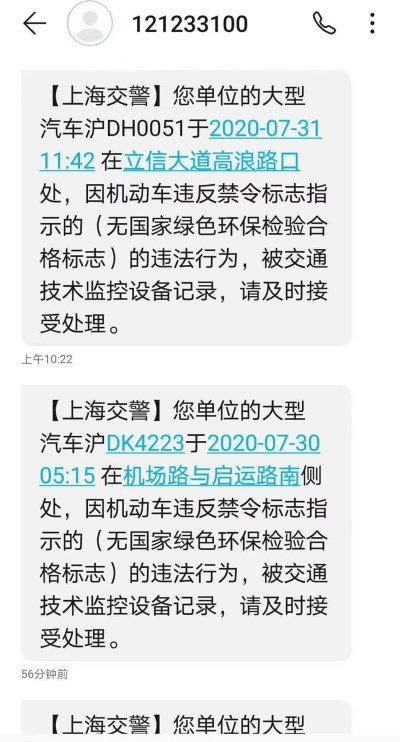 从上面多条来自上海交警的短信显示,该公司车辆之所以被处罚是因为违法禁令标志指示的(无国家绿色环保检验合格标志)的违法行为,同时被交通技术监控设备记录。