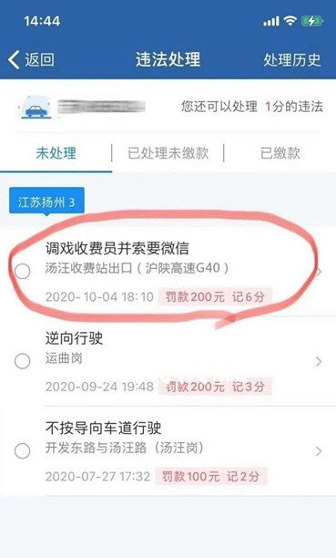 根据截图显示,共有3条违章记录未处理,而第一条处罚理由为“调戏收费员并索要微信”,地点为汤汪收费站出口,时间为2020年10月4日,处罚结果为罚款200元,记6分。