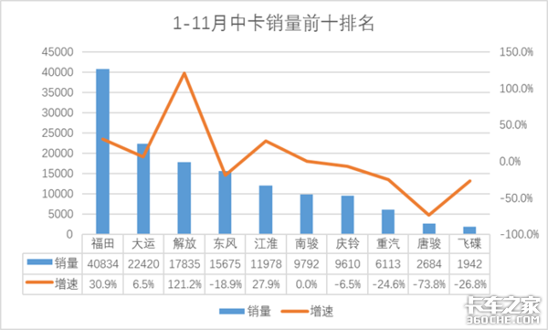 1-11月,中卡累计销售14.2万辆,同比增长11.8%。其中福田、大运、解放、江淮四家企业实现销量同比上升。前11月,福田累计销售40843辆位居榜首,解放增速达121.2%。